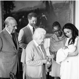 Plus tôt, le couple royal a publié sur Instagram une photo blanc-noir de leur bébé entouré de hautes personnalités : la reine Elizabeth II et le duc d’Edimbourg. Tous deux observaient, sourire aux lèvres, leur arrière-petit-fils dans les bras de sa mère. Et aux côtés de celle-ci se trouvait sa propre mère, Doria Ragland.